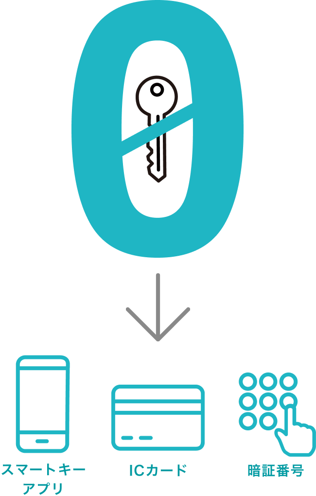 「スマートキーアプリ」「ICカード」「暗証番号」が物理鍵の代わりになることで、