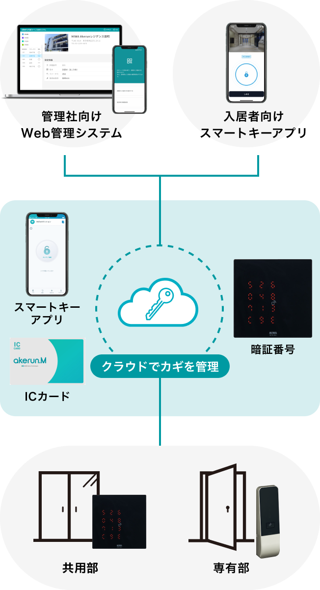 管理会社向けにはWeb管理システム、入居者にはスマートキーアプリを提供します。